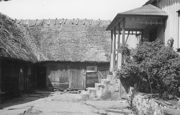 Lantgård, sannolikt Skattagården, i Stråvalla med bostadshuset till höger, där en stentrappa leder upp till farstukvisten. En sorts mullbänk buskar går längs fasaden. Nära inpå ligger ekonomibyggnaden med stråtak i vinkel så att en smal, stensatt gårdsyta bildas mellan huskropparna. Se även bildnr FHN64_1