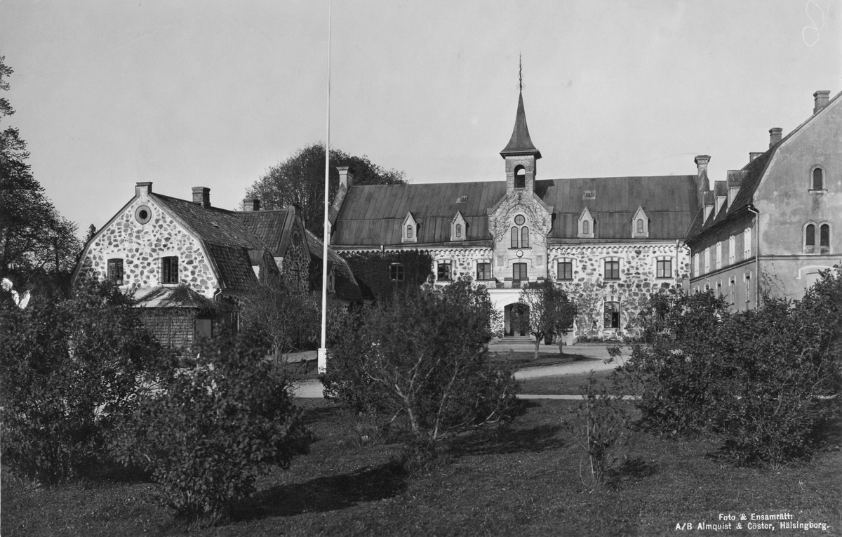 Vykort, Fröllinge gods. Mangårdsbyggnad med flyglar och i förgrunden trädgården. Oputsad gråstenstomme med en tydligt accentuerad entré på huvudbyggnaden med en frontespis krönt av ett smalt klocktorn med mycket spetsig huv. Säteriet bildades av hemmanen Fröllinge och Dahl år 1623 och samma år uppfördes huvudbyggnaden av ägaren Holger Rosencrantz med hustrun Vibike Thott. Den har renoverats bl a 1890 och på 1960-talet.