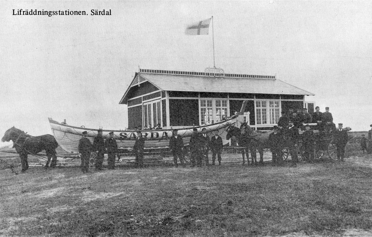 Livräddningsstationen i Särdal samt livräddningsbåten uppdragen på land med manskap och två hästekipage framför. Till höger skymtar en kvinna med ett litet barn, i övrigt endast män.