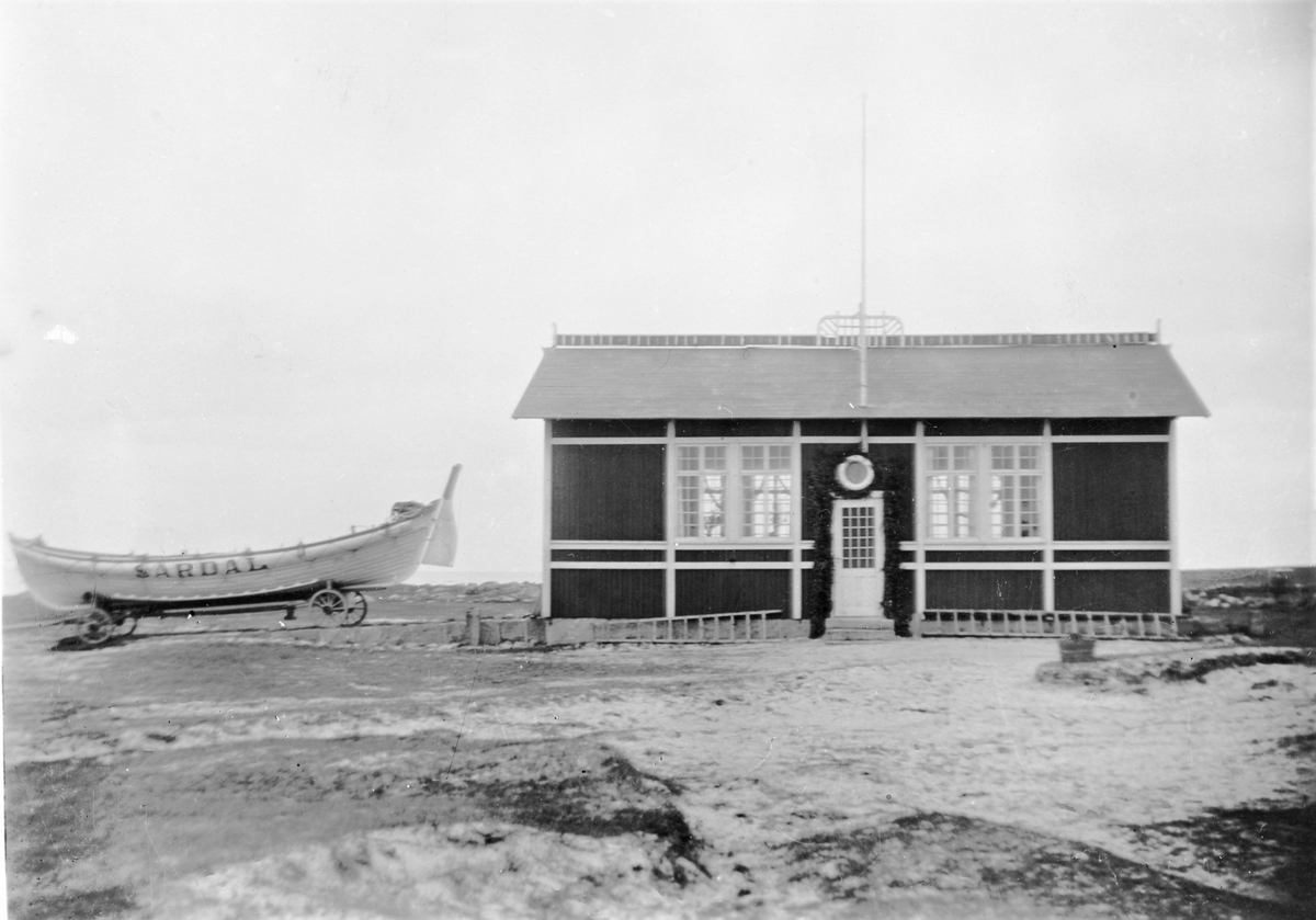 Livräddningsstationen i Särdal samt livräddningsbåten uppdragen på land till vänster i bild. Vid husgrunden ligger stegar och stationen har stora småspröjsade fönster på båda långsidorna, ett runt fönster ovanför dörren och ovan det en flaggstång på taket.