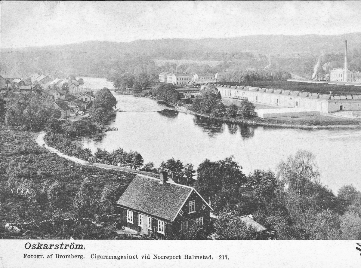 Brevkort, "Oskarström" daterat den 19 juli 1902. Motivet visar en vy över Nissan mot Skandinaviska Jutefabriken som kom igång 1890. I förgrunden ett bostadhus och vägen därifrån till en villabebyggelse, där ett nybygge pågår.