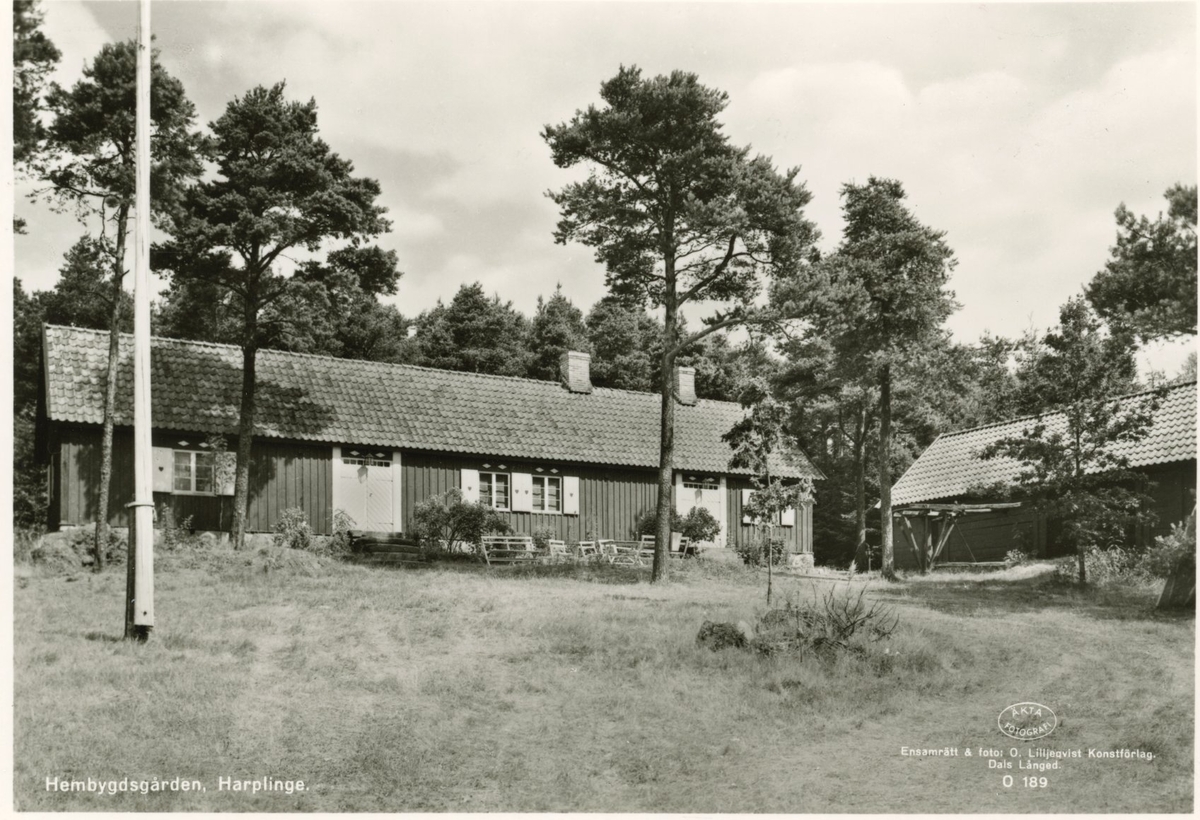 Vykort, föreställande Hembygdsgården i Harplinge. I förgrunden står en flaggstång och kring husen några tallar. Kråkegårdslängan med vita fönsterluckor och tvåbladiga dörrar är ett manhus och loftslänga från 1800-talet som flyttades hit 1941 från Kråkegård, Särdal, ägd av Hilding Henriksson, Kullsegård. Gillesstuglogen till höger i bild är från början av 1800-talet och byggd i skiftesverksteknik. Även den flyttades till hembygdsgården 1941 men från den så kallade Gillesstugan, en numera riven gård ungefär mellan Lyngåkra gamla skola och Aggaredsberg. Hästvandringen vid logen kommer från Nils Johan Andersson i Skogagård.