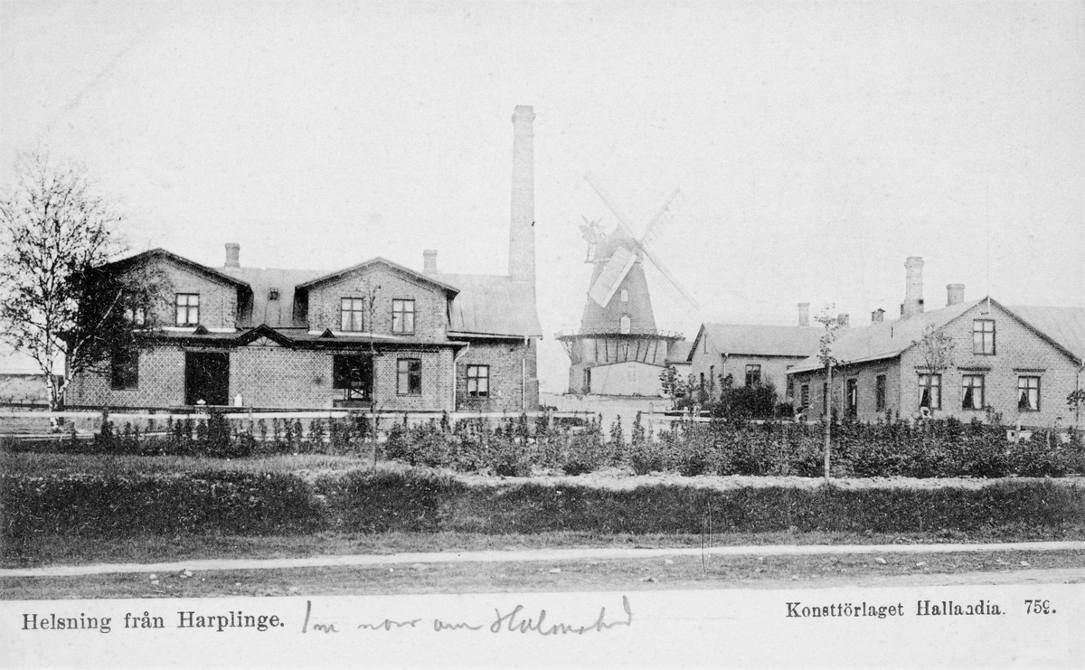 Brevkort, "Helsning från Harplinge" med sekundär notering: 1 m. norr om Halmstad. Motivet verkar vara en mindre industri med flera tegelbyggnader täckta med plåttak och flera skorstenar. Meddela oss gärna om du känner till byggnadernas funktion!