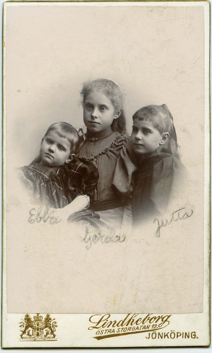 Porträtt på Ebba Andersson till vänster i bilden född 1891 död 1920, Judith Andersson ( gift Lindgren) till höger i bilden född 1888 död 1963. I mitten står Gerda Andersson.