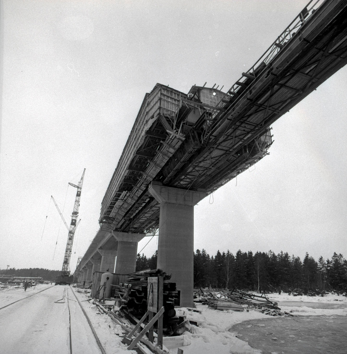 Vy från byggandet av Ölandsbron. In mot Svinö med vägbanken brdvid bron. Vägbanan har börjat gjutas.