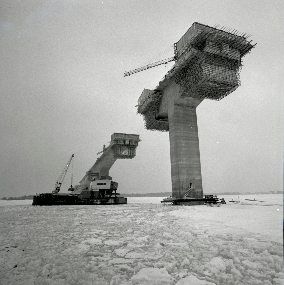 Vy från byggandet av Ölandsbron. Vägbanorna byggdes mot varandra, ut från pelarna, i flyttbara gjutvagnar.