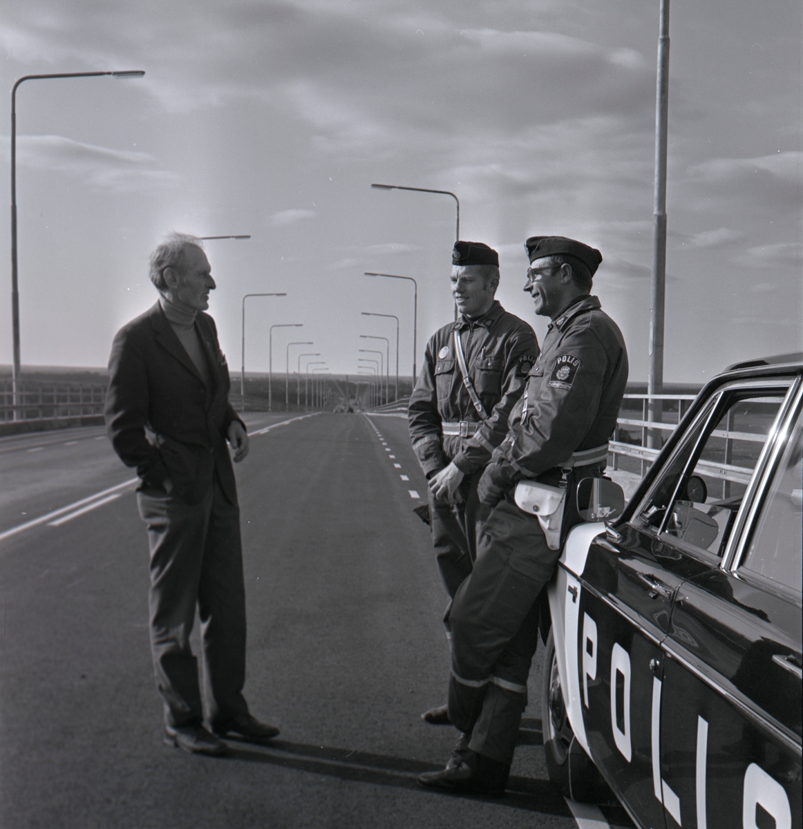 En man i samspråk med poliser när den färdigbyggda men inte invigda Ölandsbron visades för allmänheten.