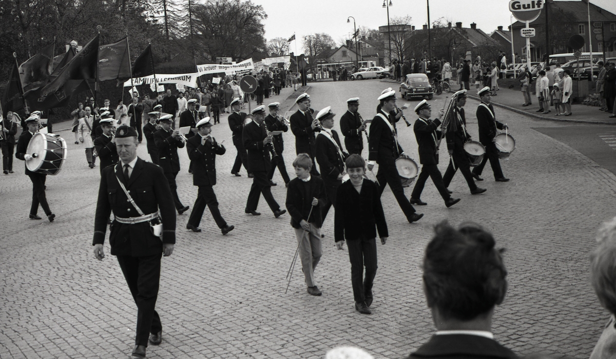 Musikkåren Lyran i spetsen för första maj-tåget 1968.