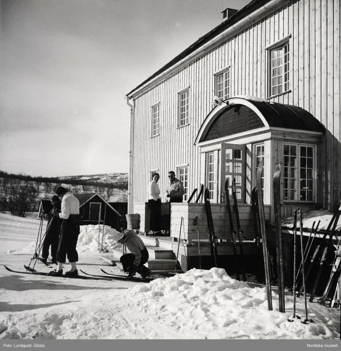 Folkliv vid Abisko turiststation, STF. Före utfärden; män och kvinnor spänner på sig skidorna. Påsk.