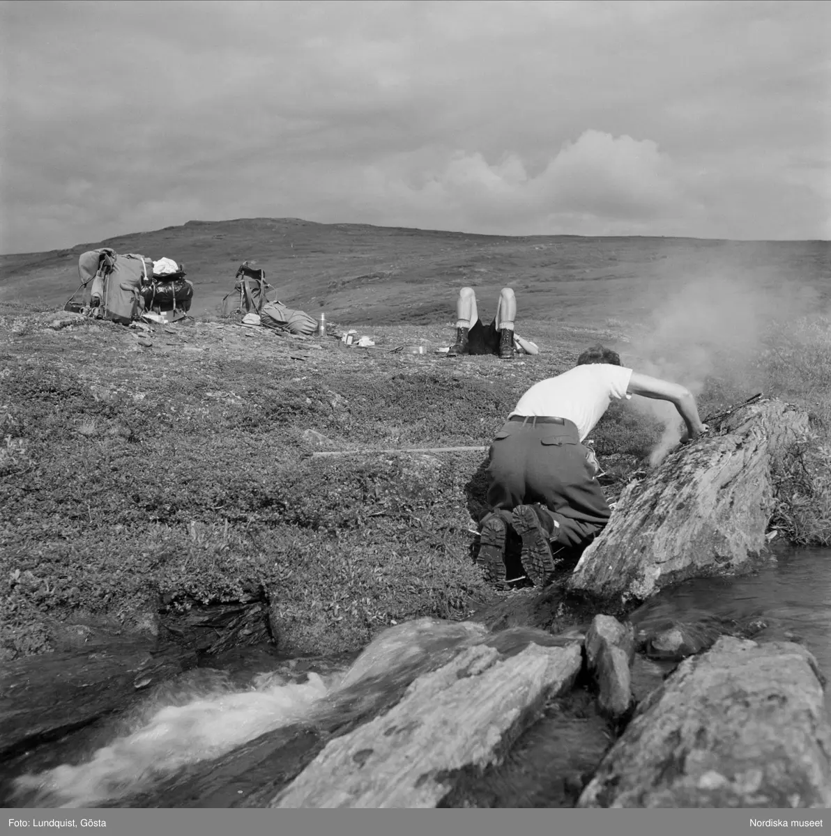 Dag Hammarskjöld på fjällvandring på Sulitelma. Två män har slagit läger, den ene ligger på rygg och vilar medan den andre gör upp eld vid ett klippblock.