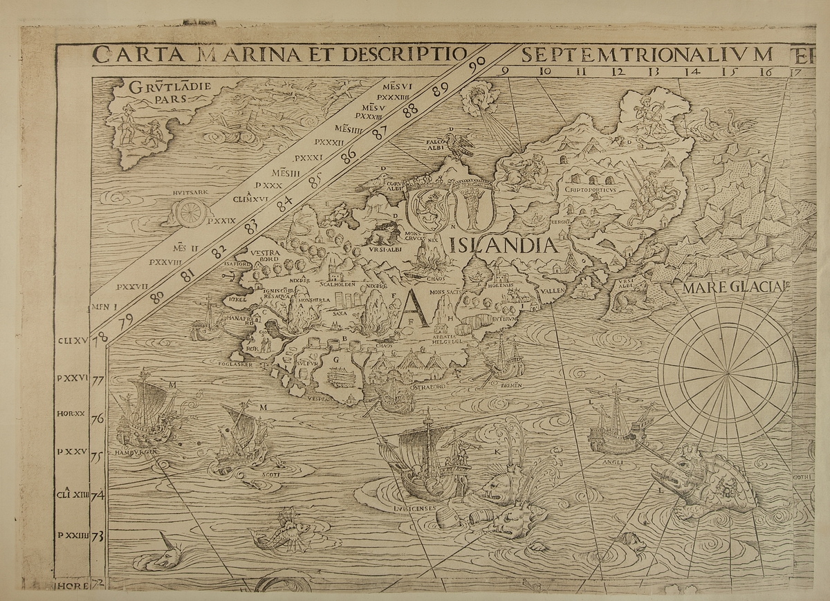 Karta, Olaus Magnus Carta Marina detalj, Island med rikliga illustrationer av folkliv, djur och natur. Daterad 1539