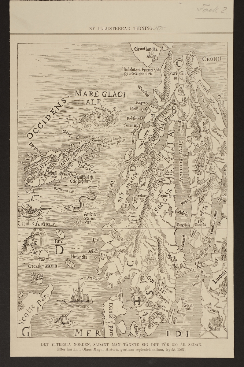 Karta över Norden. "DET YTTERSTA NORDEN, SADANT MAN TÄNKTE SIG DET 300 ÅR SEDAN. Efter kartan i Olaus Magni Historia gentium septentrionalium, tryckt 1567."