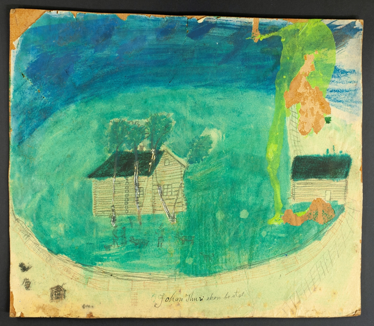 Teckning och akvarell av Johan Turi. Tomt omgiven av staket, bostadshus.