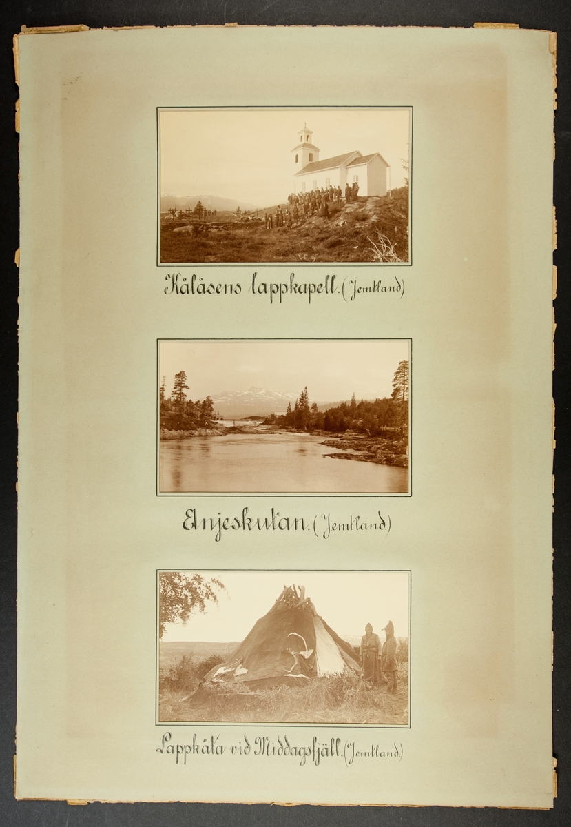 Ark med tre monterade fotografiska motiv från Jämtland. Kålåsens samekapell, Elnjeskutan samt kåta vid Middagsfjäll. L.A. 1306