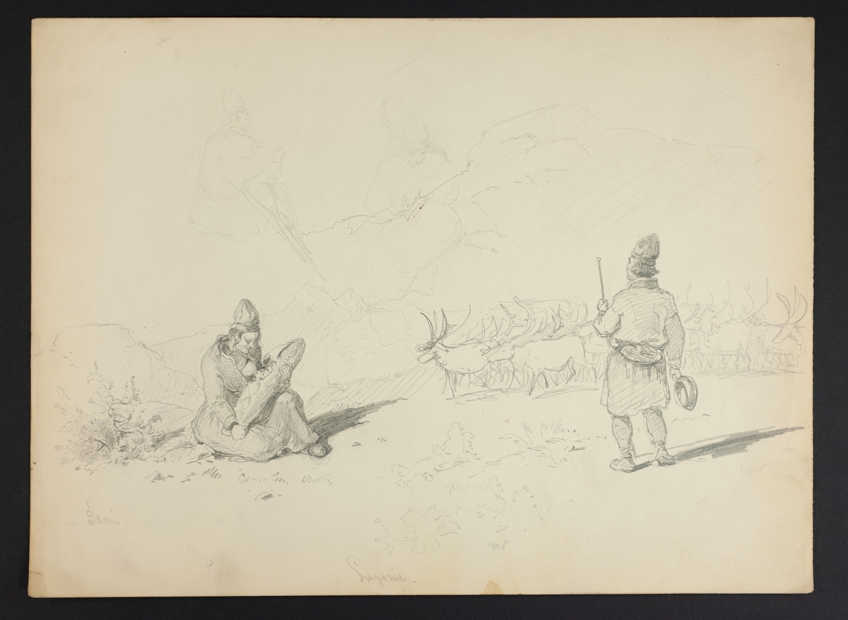 Teckning. En kvinna sitter och ammar sitt barn. L.A. 1657. Sannolikt av P Holm under resa i Jokkmokks socken 1861.