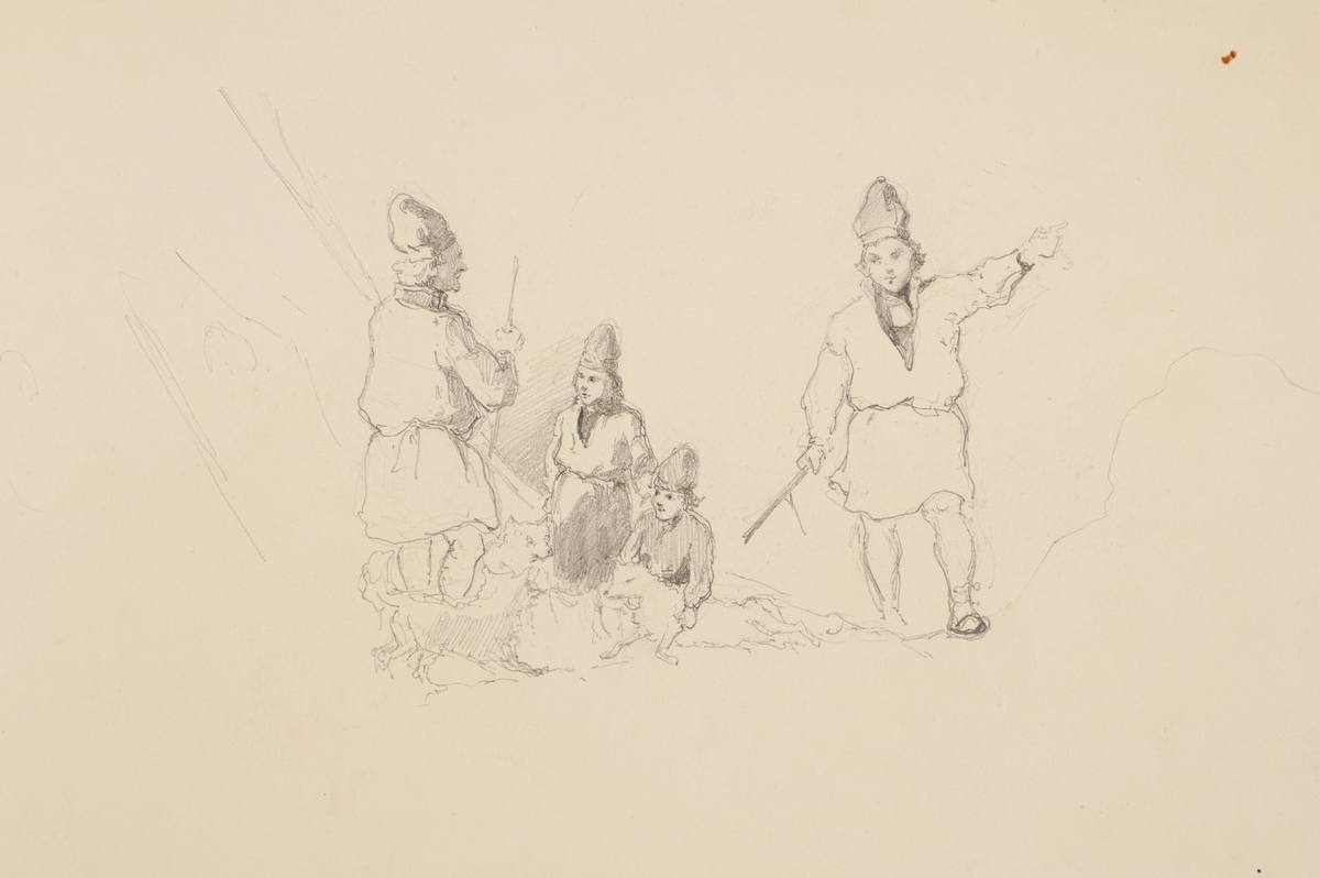 Teckning, skiss. En grupp samer med hundar. L.A. 1657. Sannolikt av P Holm under resa i Jokkmokks socken 1861.
