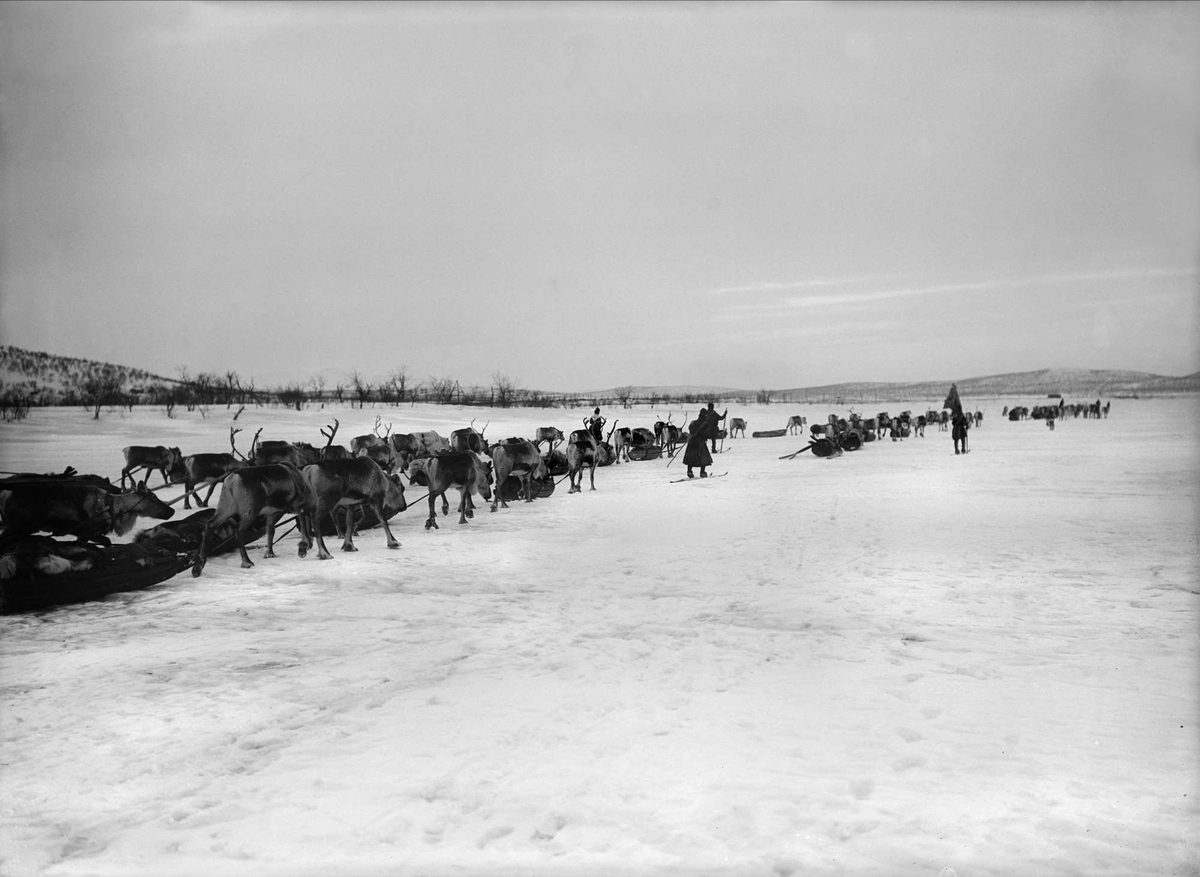 Renar och människor i flyttningsrajd. Loussajärvi, Jukkasjärvi, Norrbotten.