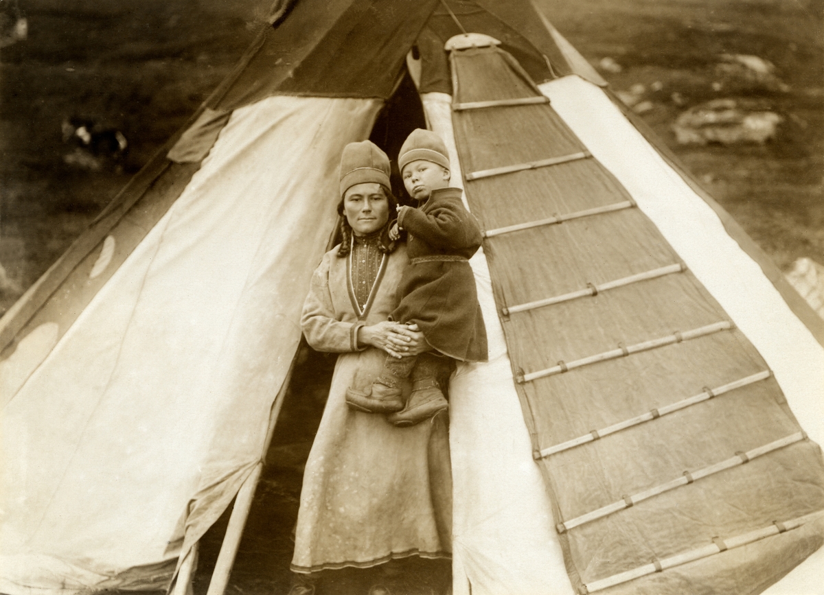I öppningen av en kåta står en kvinna med ett barn i famnen.