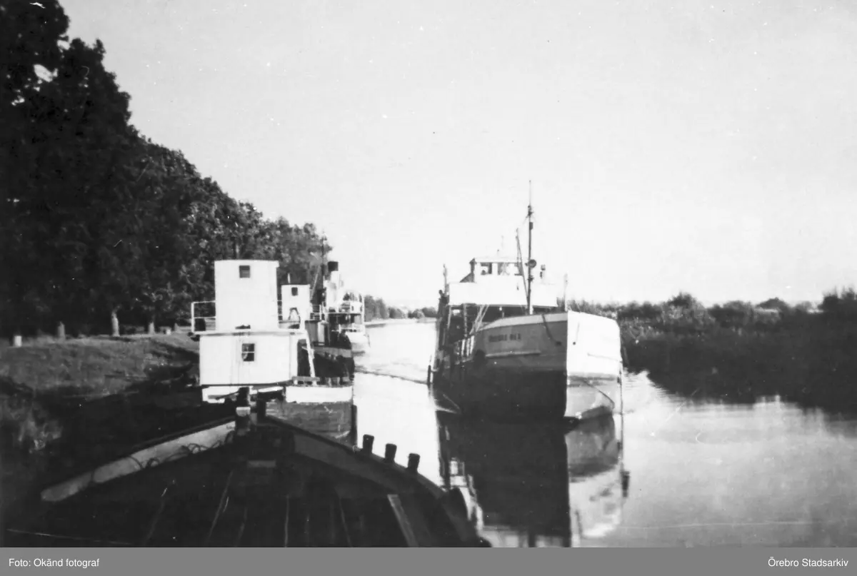 Örebro Rex paserar pråmar på Örebro kanal, ca 1950