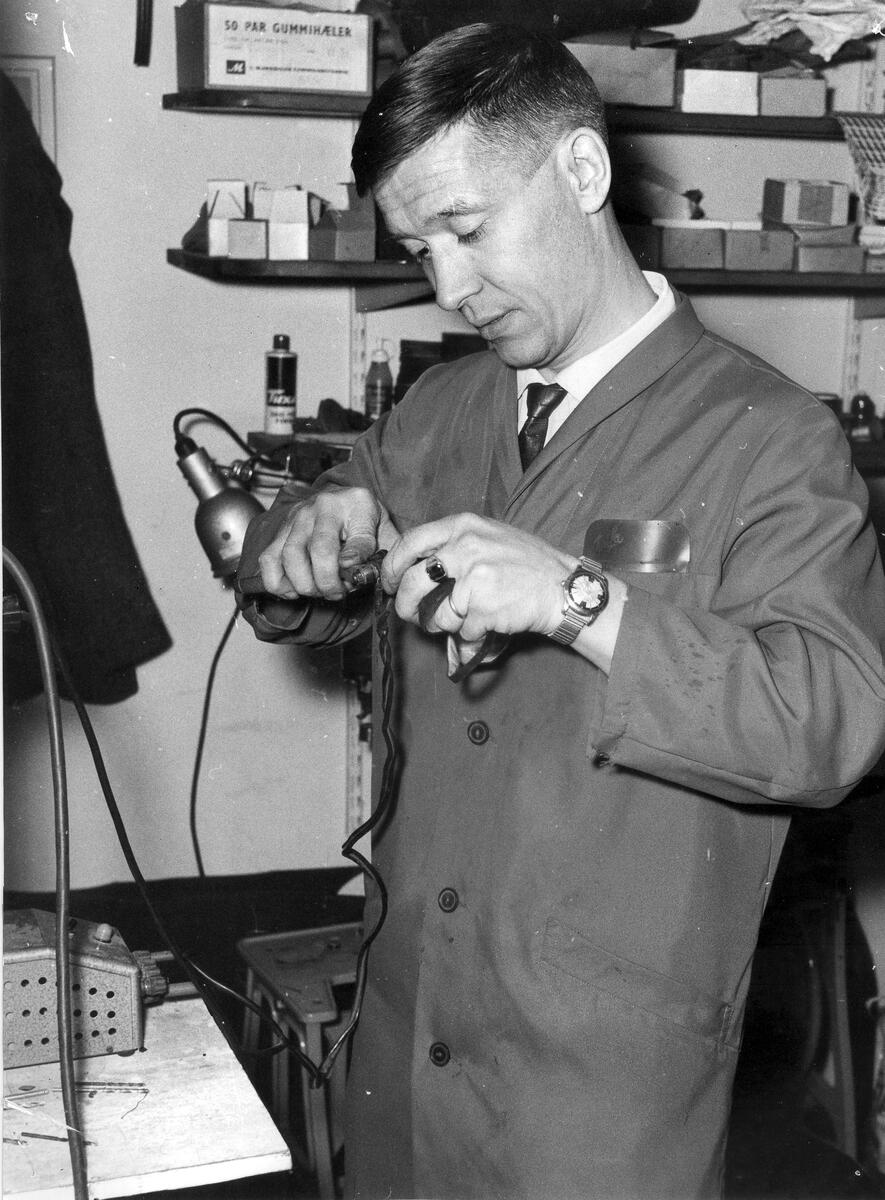 Hos skomakaren. Moderna hjälpmedel utnyttjas.