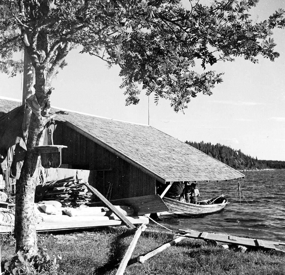 Fiskaren Erik "Ecke" Åströms sjöbod. Bröderna Erik och Ernst Åström fiskade tillsammans. Kortet är taget före kriget och bägge bröderna fiskade ihop innan Ernst blev inkallad då Ecke fick fiska själv.