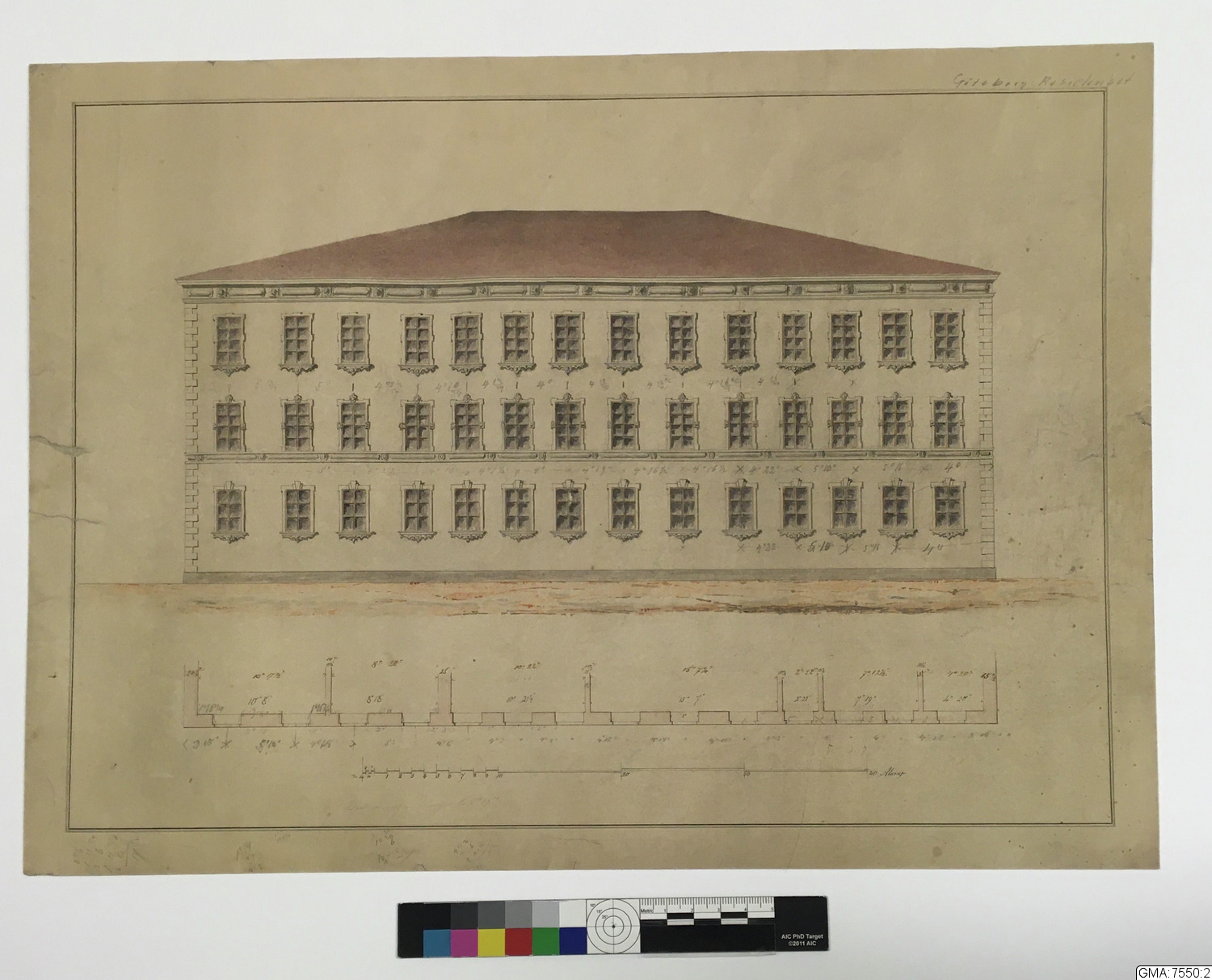 Akvarellerad tuschritning till förändring av Residenset (norra? fasaden).