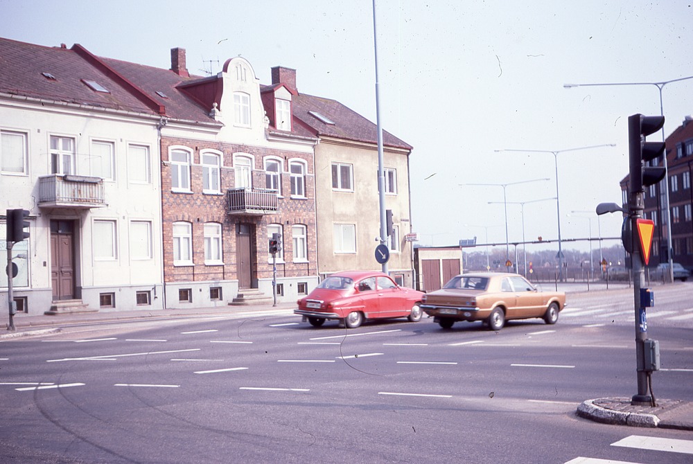 I förgrunden flerfilig gatukorsning med bilar. Till vänster rad med tvåplanshus. I bakgrunden gata och flervåningshus.