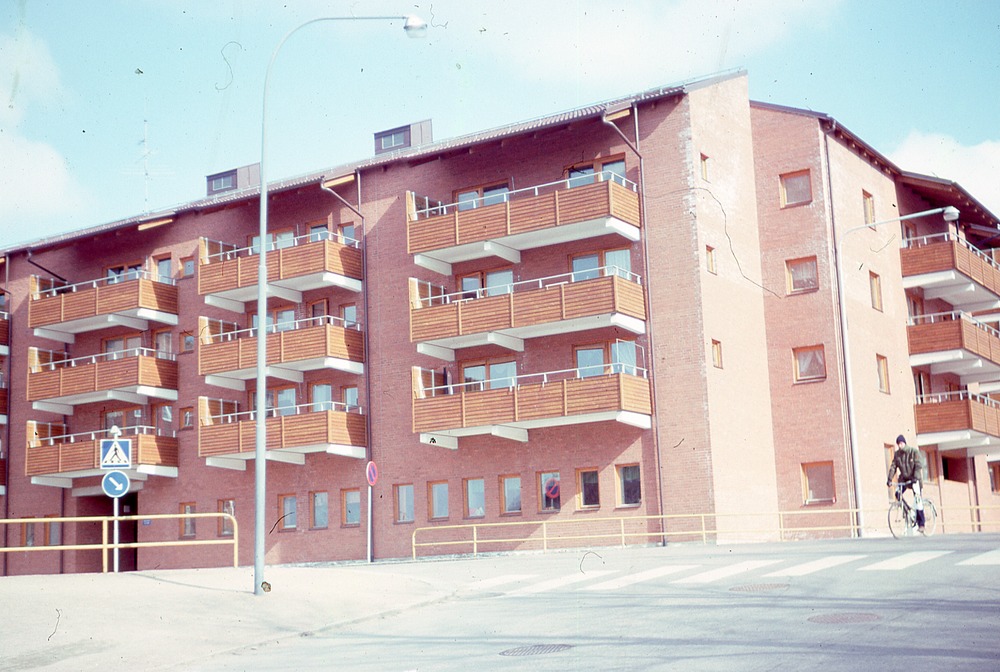 I förgrunden gatukorsning med övergångsställe. I bakgrunden fyravåningshus med balkong. Det finns ett staket.