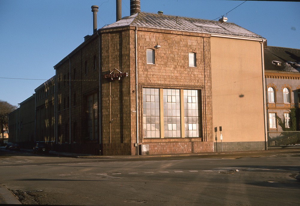 I förgrunden gatukorsning. I bakgrunden hög byggnad, bryggeri. På huset står det troligen PRIPPS.