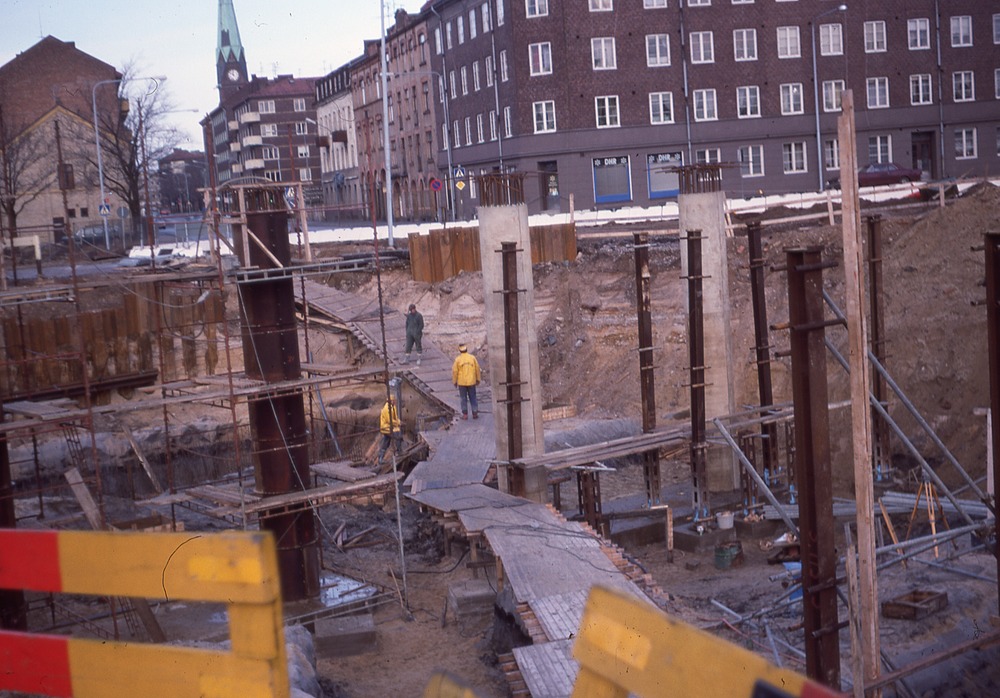 I förgrunden en djup grop med byggnadsställningar och tre arbetare. I bakgrunden gata omgiven av flervåningshus. I ett fönster står det DHR.