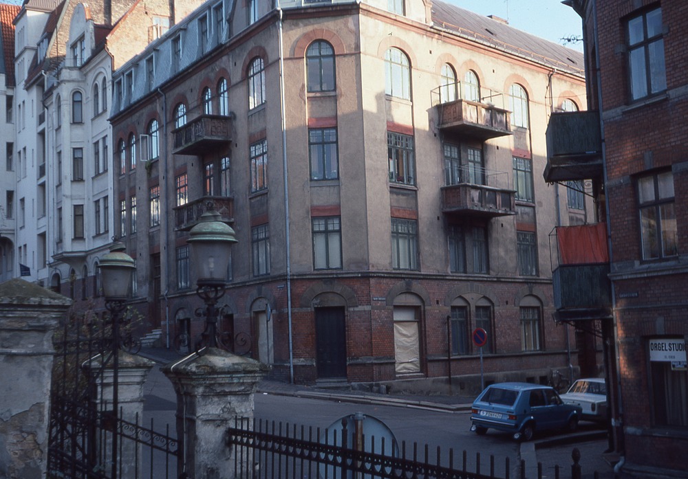 I förgrunden gatukorsning med parkerad bil. I bakgrunden femvåningsbyggnader. Till vänster staket delvis i smide. I ett fönster står det Orgel studio.