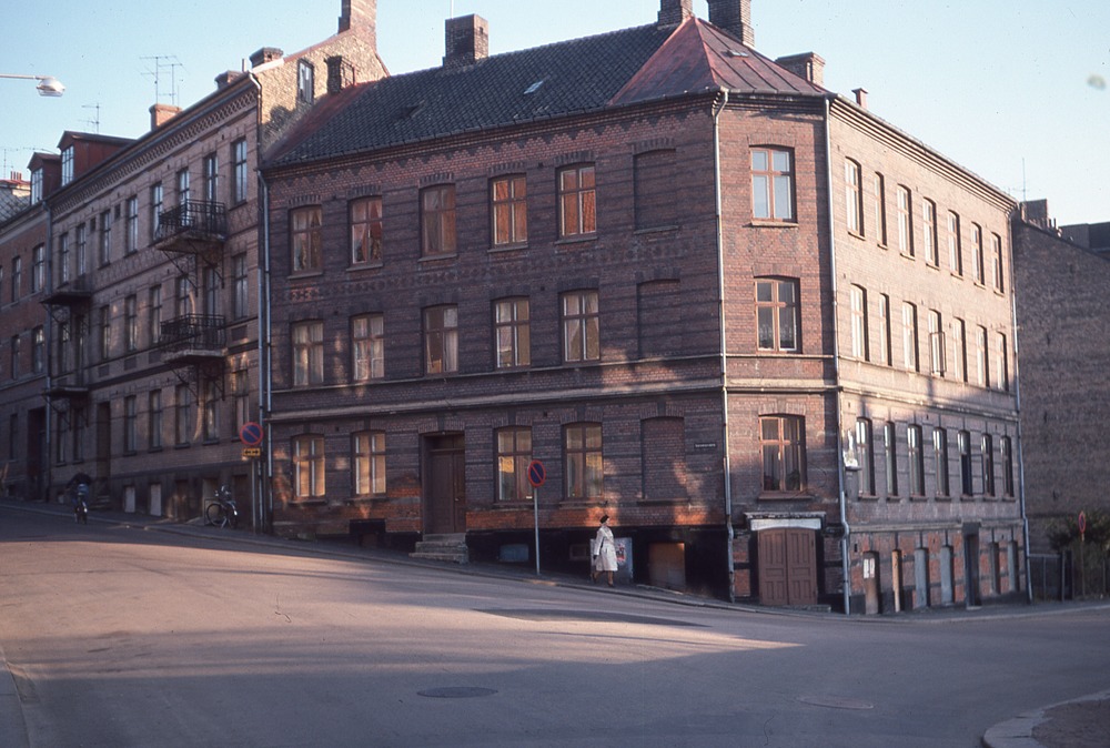 I förgrunden gatukorsning. I bakgrunden tre- till fyra våningsbyggnad. En kvinna promenerar