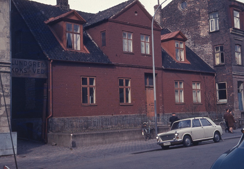 I förgrunden gata med parkerad bil. I bakgrunden två- och treplanshus, bostadshus. På en skylt står det Lundgrens koks, ved