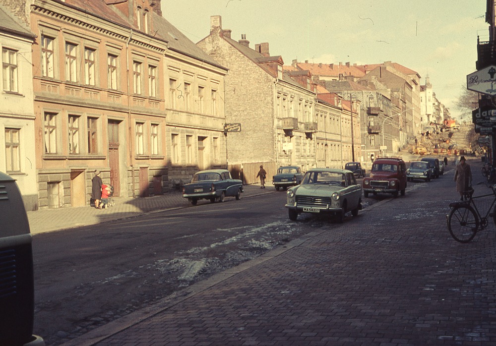 I förgrunden gata med parkerade bilarl. Till vänster tvåplanshus, bostadshus.