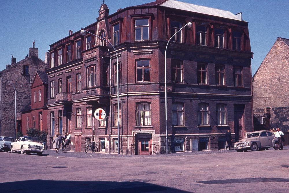 I förgrunden gatukorsning. I bakgrunden trevåningshus. På en skylt en stövel och texten Sko-rep.