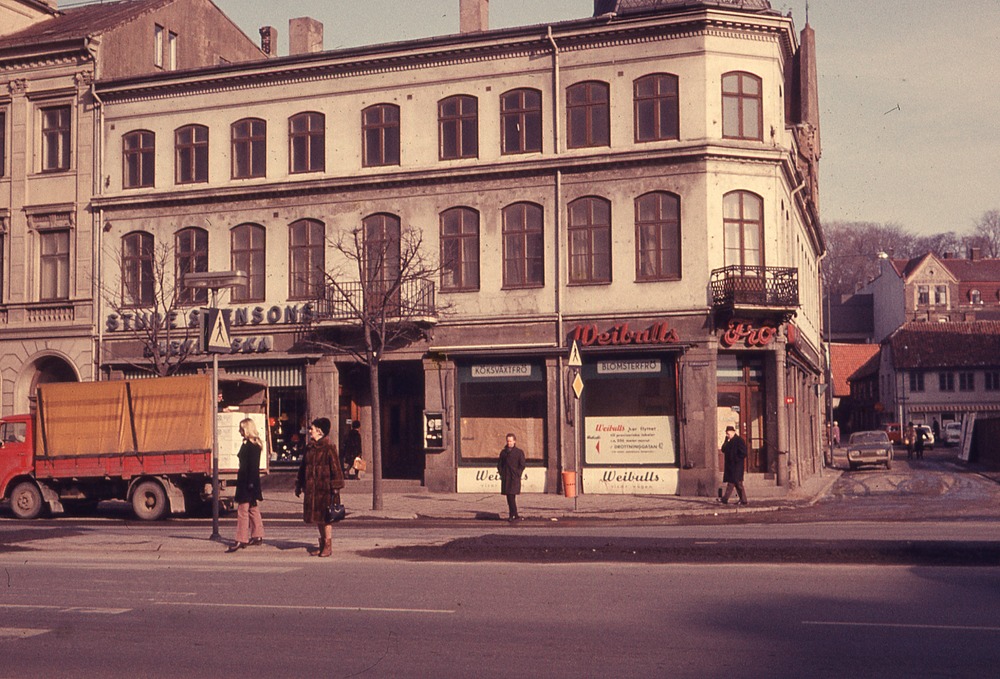 I förgrunden gata med övergångsställe. I bakgrunden trevånigsbyggnad bostadshus med butiker i bottenplanet. Framför huset står en lastbil. På skyltar står det Weibulls frö, Köksväxtfrö, Blomsterfrö, har flyttat, Sture Svenssons (?)