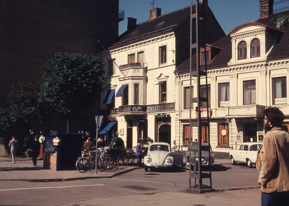I förgrunden gata. Till vänster torg med träd och cyklar. Där kommer bilar. I bakgrunden två- och trevåningsbyggnader. På huset står det conditori, Café, Finbageri