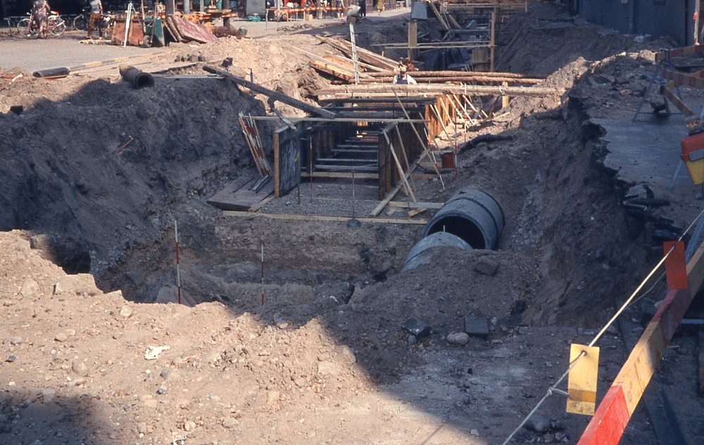 I förgrunden stadsgata som är uppgrävd. I gropen finns byggnadsställning och rör.