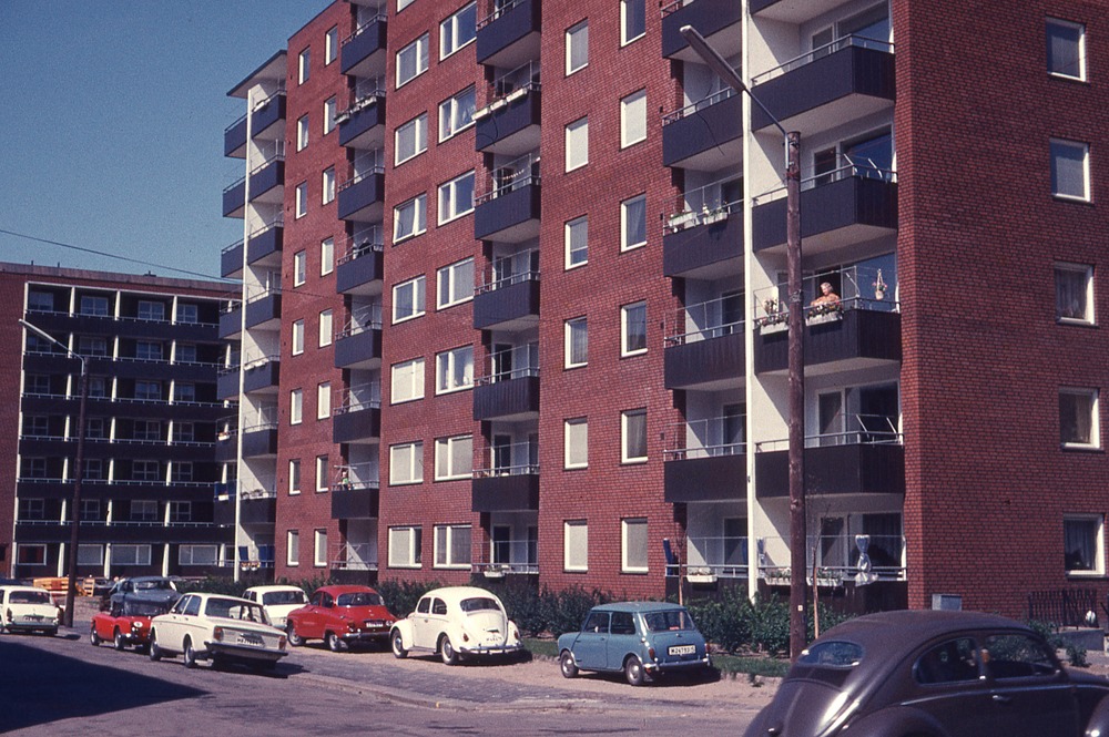 I förgrunden gata, parkering med bilar. I bakgrunden flervåningshus med balkonger, boststadshus.
