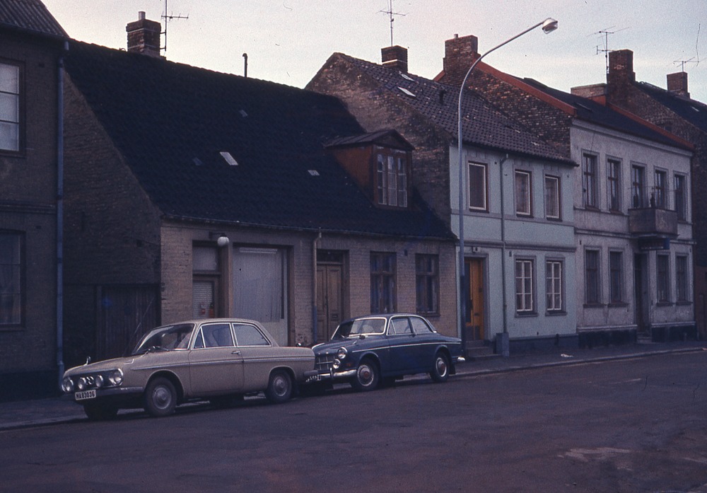 I förgrunden stadsgata med parkerade bilar. I bakgrunden en- och tvåplanshus, bostadshus