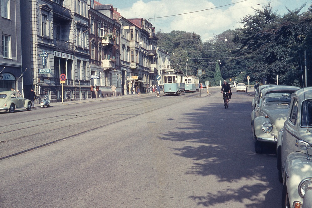 I förgrunden gata med parkerade bilar och spårvagnar. På vänster sida flervåningshus, bostadshus med butiker i bottenplanet. I bakgrunden träd, park.