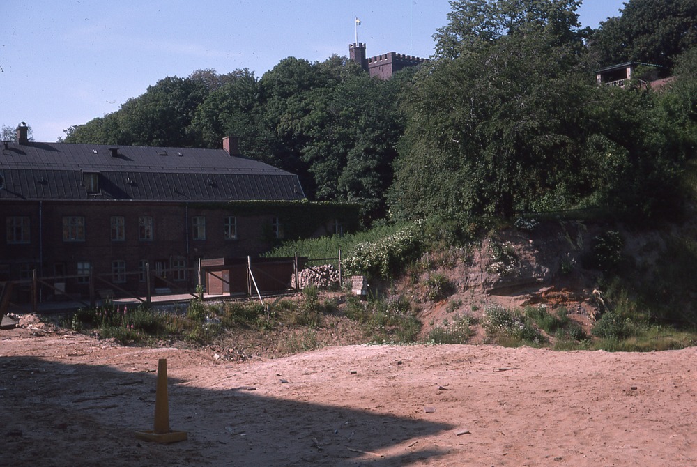 I förgrunden öppen yta med grus, markarbete pågår. I bakgrunden byggnad och träd
