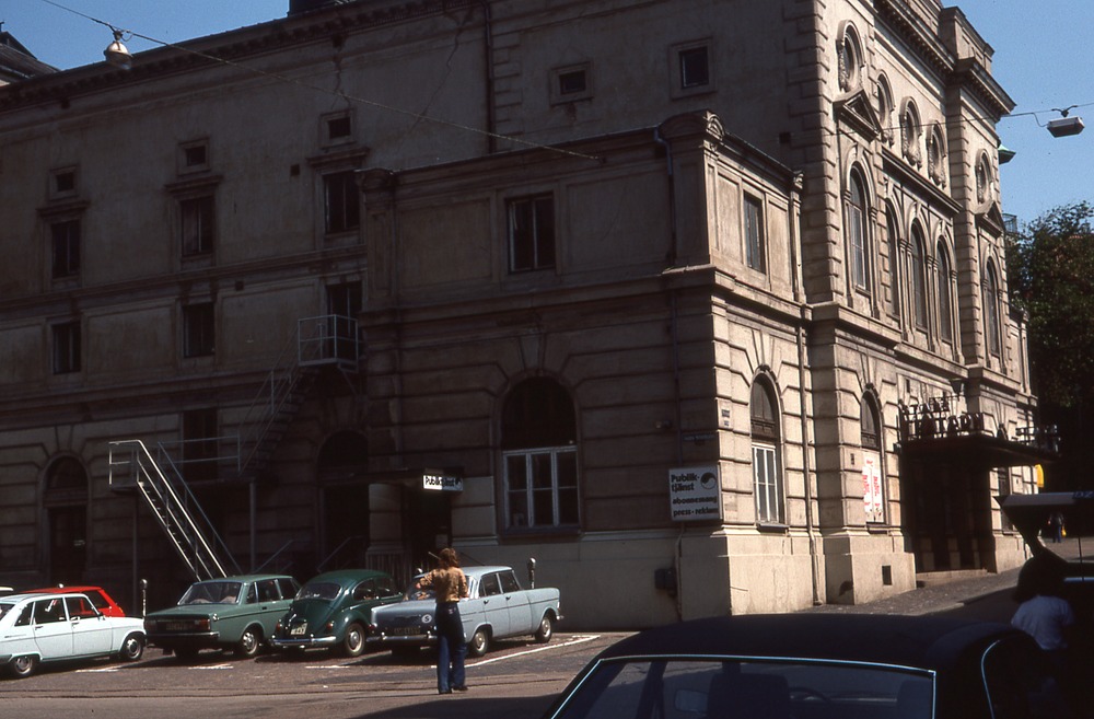 Mitt i bild byggnad, Helsingborgs stadsteater. Till höger stadsgata. På byggnadens baksida ligger en parkering med bilar.