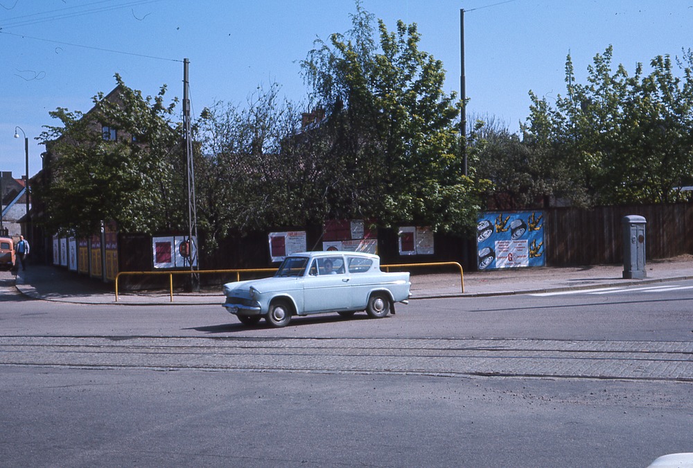 I förgrunden gatukorsning med bil. I bakgrunden staket och träd. Där sitter reklamskyltar.