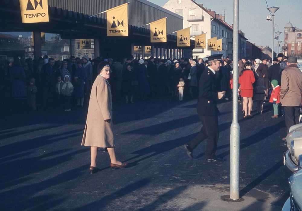 I förgrunden öppen yta med köande människor. I bakgrunden husfasad med vimplar med texten ÅH TEMPO