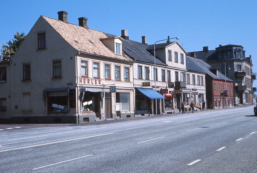 I förgrunden stadsgata. I bakgrunden tvåvåningshus med affärer i gatuplanet. På skyltar står det Herler, xxx Fisk, Musik & Radiocity, Philips TV, Sko xxxx, King cyklar.