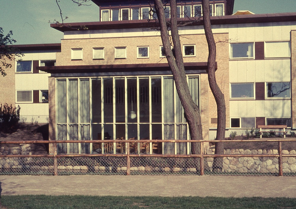 I förgrunden staket och mur samt träd. I bakgrunden del av trevåningsbyggnad med utstickande matsal med högt i tak.