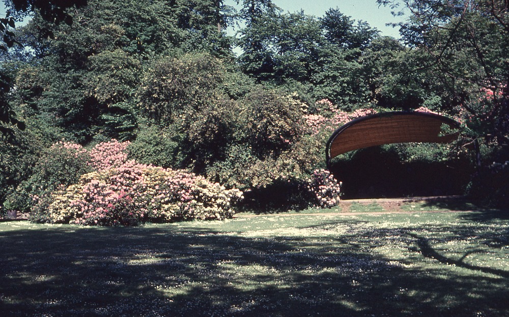 I förgrunden en gräsmatta. I bakgrunden buskar träd och Rhododendron samt en liten scen med tak