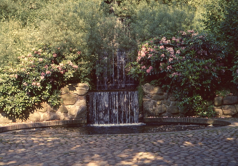 Ett murat vattenfall i tre nivåer. I förgrunden stenläggning och i bakgrunden buskar, rododendron och träd.