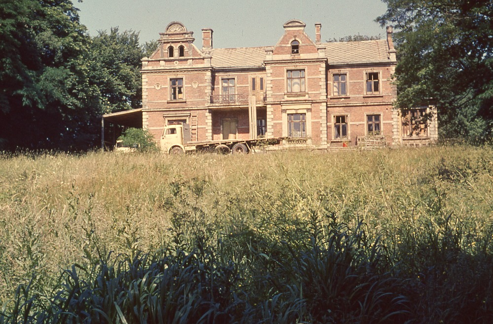 Bilden föreställer en villa omgiven av träd. I förgrunden en åker och vid huset står en lasbil.